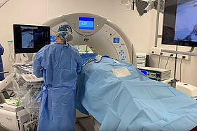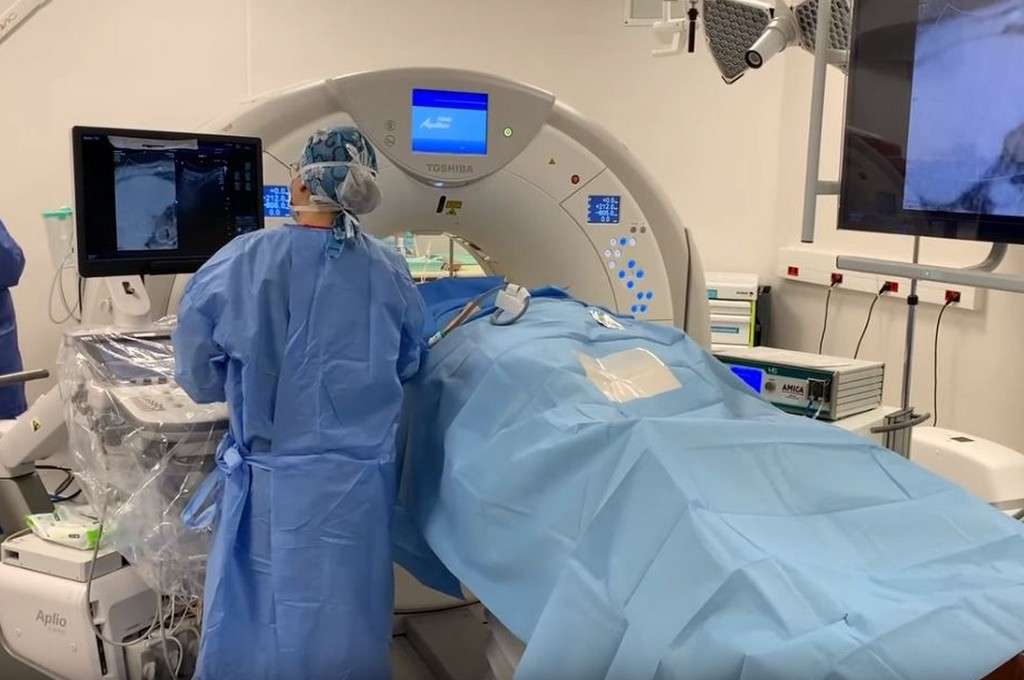 Avec l’installation d’un arceau de radioscopie, le CHU de Rennes vient de finaliser l’équipement de sa nouvelle salle d’imagerie interventionnelle partiellement ouverte il y a un an. Située au niveau -1 du centre urgences réanimations (CUR), cette salle opératoire réunit désormais les trois modalités de guidage en imagerie (scanner, échographe, arceau de radioscopie mobile). Unique salle à disposer d’un tel équipement, elle ouvre la voie au développement de stratégies thérapeutiques innovantes.